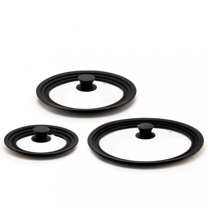 Univerzální poklice s tvrzeného skla se silkonovým okrajem na hrnce, pánve, kastroly a rendlíky. Poklici lze použít na 3 různé průměry nádobí: 28 cm, 30 cm a 32 cm.