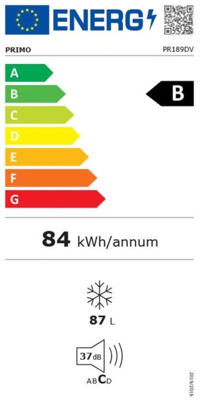 Volně stojící šuplíkový mrazák PRIMO PR189DV je s energetickým štítkem B a roční spotřebou energie přibližně 84 kWh/rok velmi úsporný, zejména ve srovnání s jinými mrazáky této velikosti.
