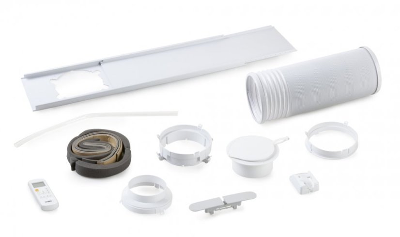 - Sada na umiestnenie výfuku vzduchu do otvoreného okna (plochý výfukový diel - dĺžka 67,5 cm, penové tesnenie, adaptér na hadicu) - vhodné pre posuvné okná