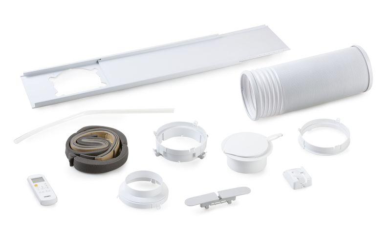- Súprava na uchytenie hadice na odvod teplého vzduchu do okna (pre vertikálne, alebo horizontálne posuvné okná): okenná výsuvná lišta o dĺžke 67,5-120 cm (šírka 16,5 cm), príruba na hadicu pre ľahké uchytenie do lišty, penové tesnenie