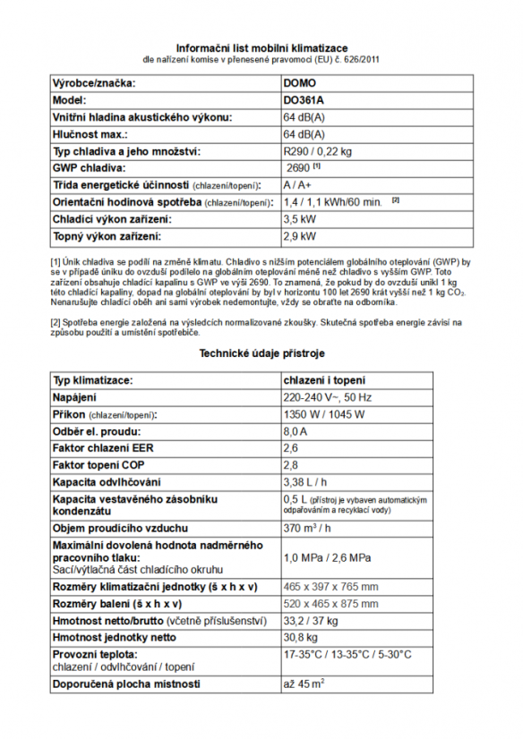 - Typ klimatizácie: mobilná klimatizácia s kúrením