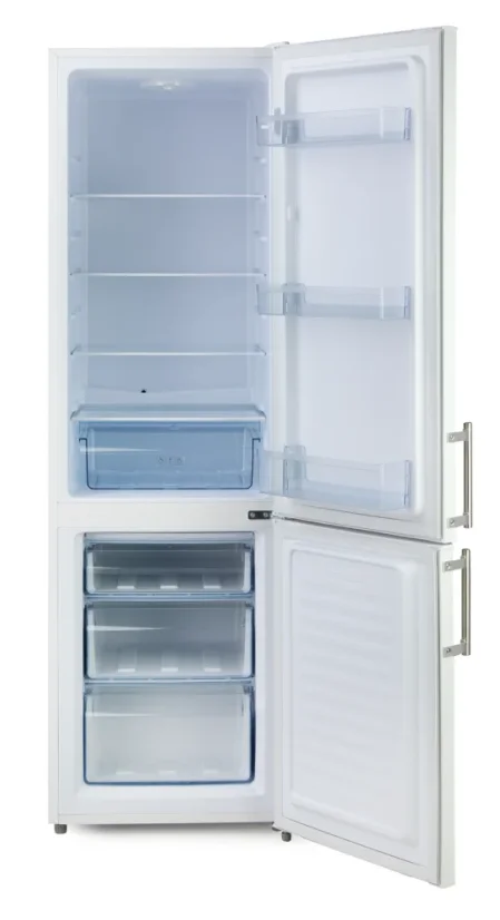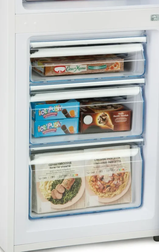 Celkový objem 244 litrov poskytuje komfortný priestor na potraviny celej domácnosti – prehľadná chladnička s objemom 181 l a praktická mraznička s objemom 63 l s tromi priehľadnými zásuvkami. Elegantné biele vyhotovenie so skosenými hranami dverí a robustnými hliníkovými madlami dodá vašej kuchyni moderný vzhľad.