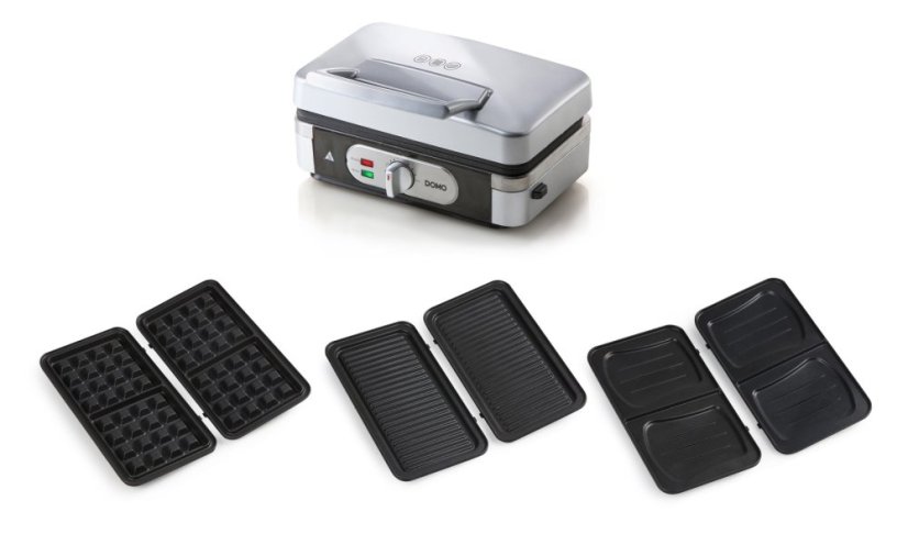 V jednom balení dostanete tri prístroje: sendvičovač, vaflovač a panini gril. Jednotlivé dosky na pečenie sú ľahko vymeniteľné a vďaka kvalitnému nepriľnavému povrchu aj ľahko čistiteľné.